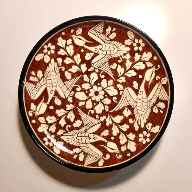 بشقاب یا دیوارکوب سرامیکی دستساز و نقاشی شده با دست با طرح سفال های تاریخی نیشابور توسط هنرمندان ایرانی.