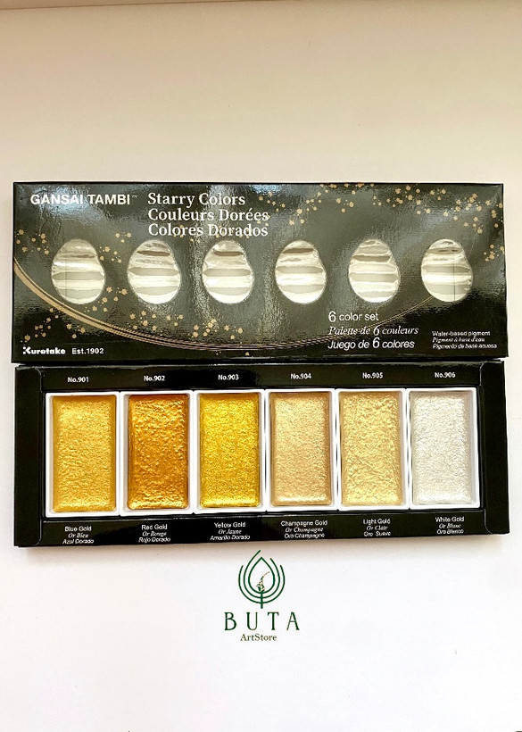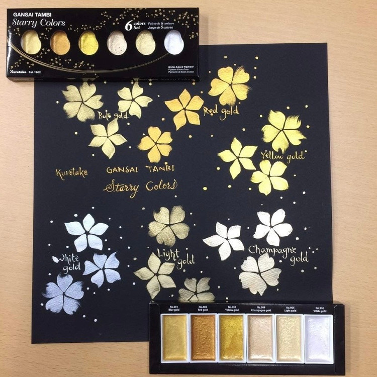 آبرنگ طلایی حرفه ای 6 رنگ ژاپنی اصل kuretake cansai دارای پیگمنت عالی جهت استفاده در تذهیب، خوشنویسی و دیگر آثار هنری.
